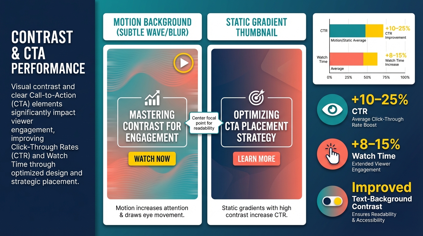 Contrast and focal hierarchy increase click-throughs and watch time by making the call to action and subject readable across devices. Model benchmarks: improving text-background contrast and centering the focal point typically yields 10–25 percent higher CTR and 8–15 percent longer average watch time. Motion backgrounds increase attention for short clips, static gradients increase CTR for thumbnail-driven posts. Why these elements work: contrast reduces visual search time, clear hierarchy directs gaze, rhythm and negative space reduce cognitive load, and motion increases attentional capture.