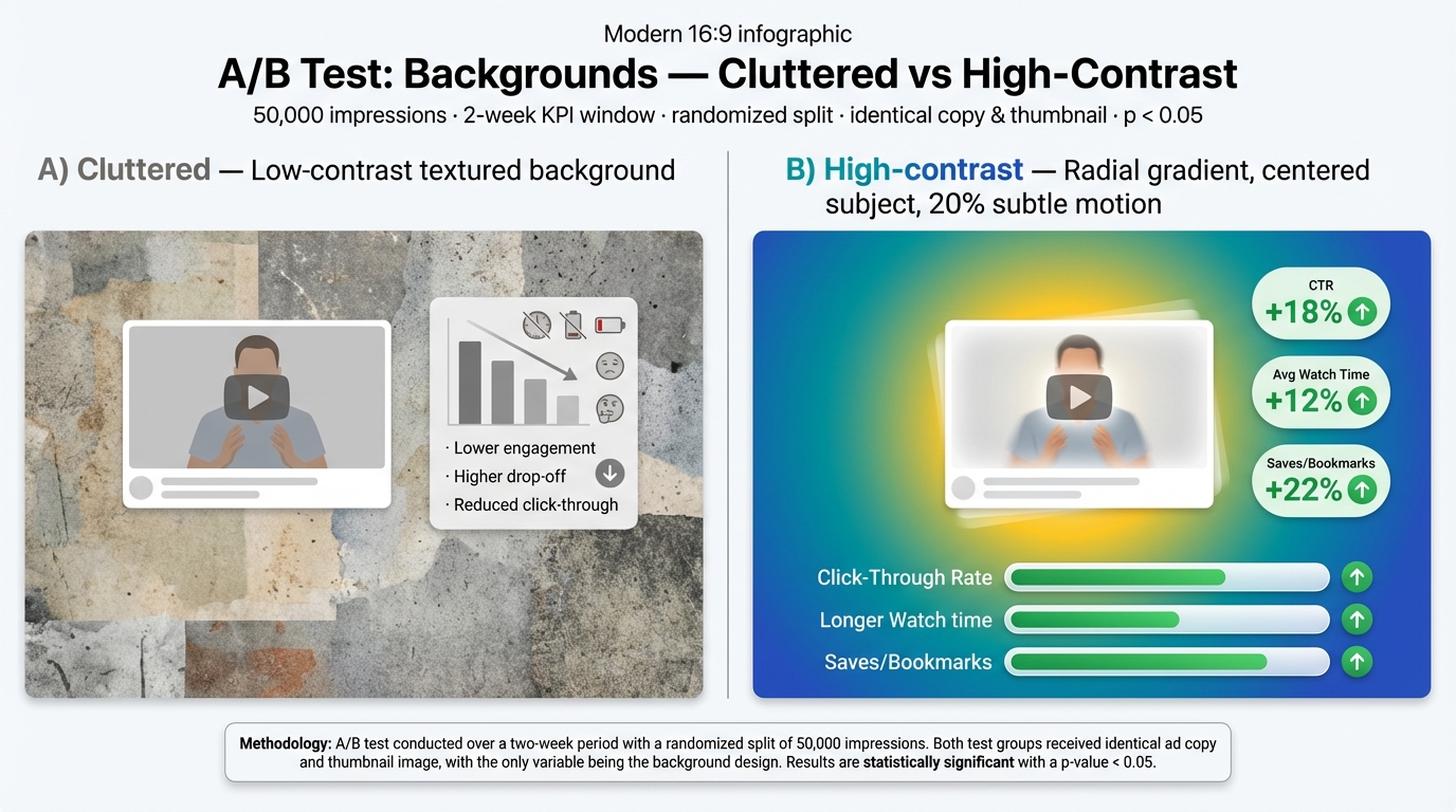 You run a randomized A/B on 50,000 impressions comparing: A) cluttered textured background with low contrast, B) high-contrast radial gradient with centered subject and 20 percent subtle motion. KPI window two weeks. Results: CTR +18 percent, average watch time +12 percent, saves/bookmarks +22 percent. Methodology: identical copy and thumbnail subject, uniform audience split, significance p < 0.05.