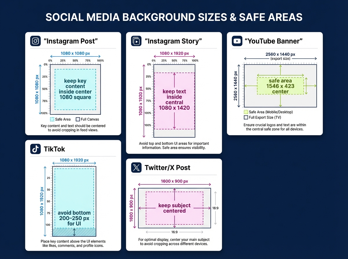 - TikTok: 1080 x 1920, avoid bottom 200–250 px for UI.